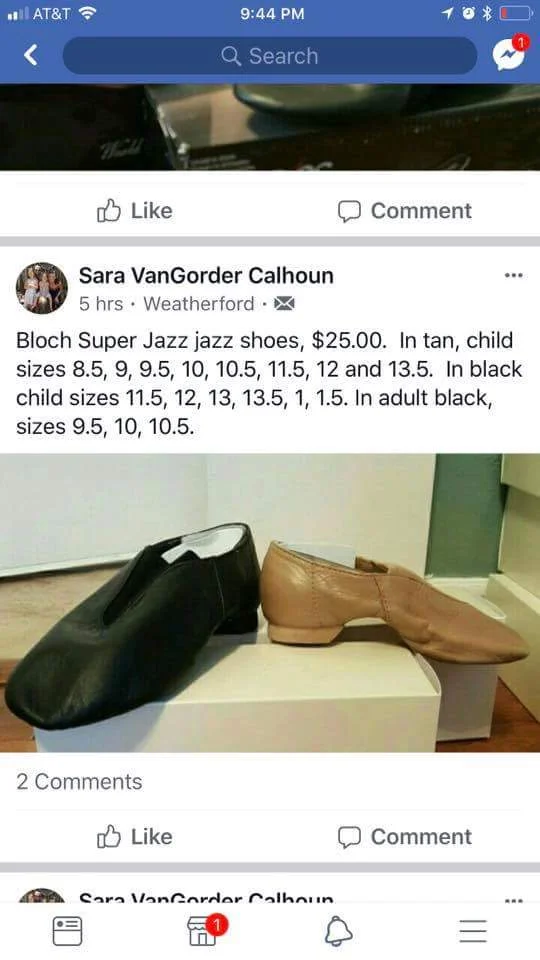 Everyone else with the exception of Winkies & Lullaby League needs black jazz or black ballet, either is fine. Call Sara Calhoun with Perfect Pointe Dance Supply (817) 437-5506.